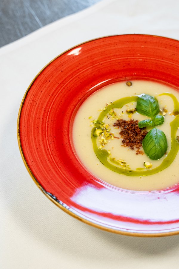 in pistachio crust, porcini mushroom sauce, Hasselback potatoes, wild broccoli