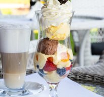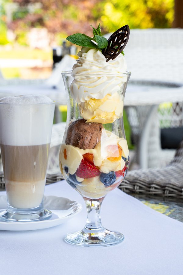 with demi-glace sauce, belgian fries or sweet potatoes, herb composition