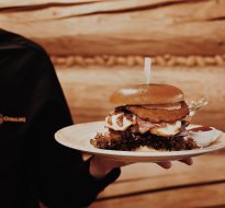 HIGHLANDER BURGER WITH BACON, OSCYPEK CHEESE, AND POTATO PANCAKE