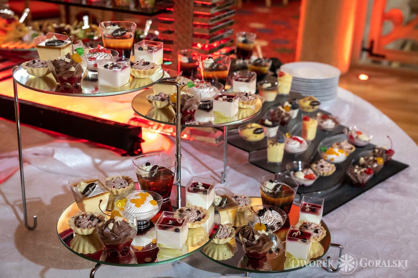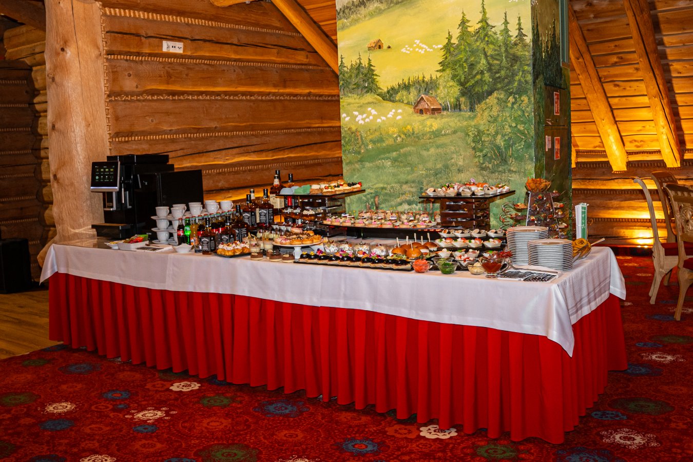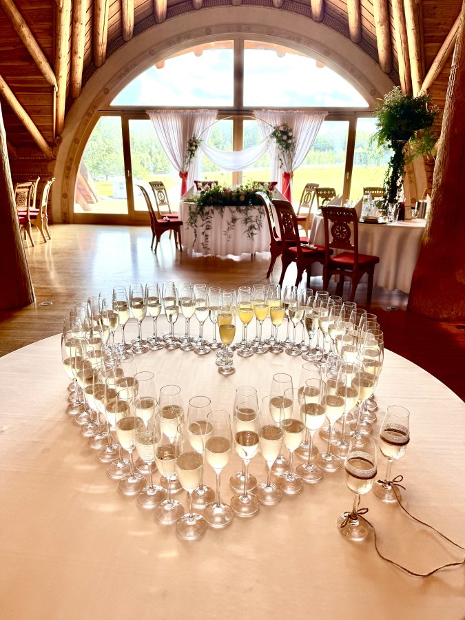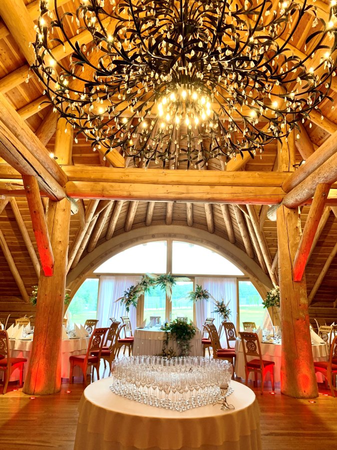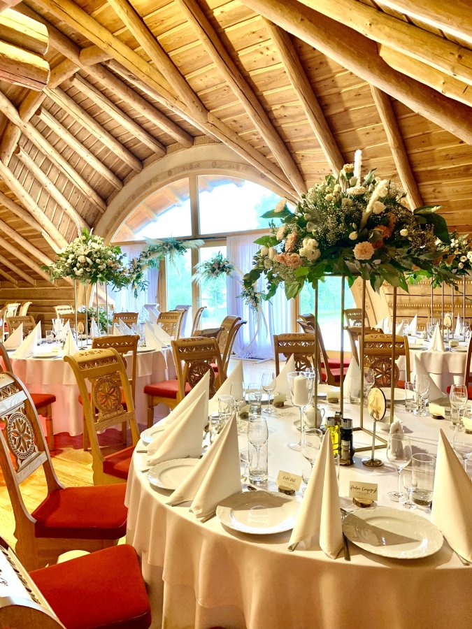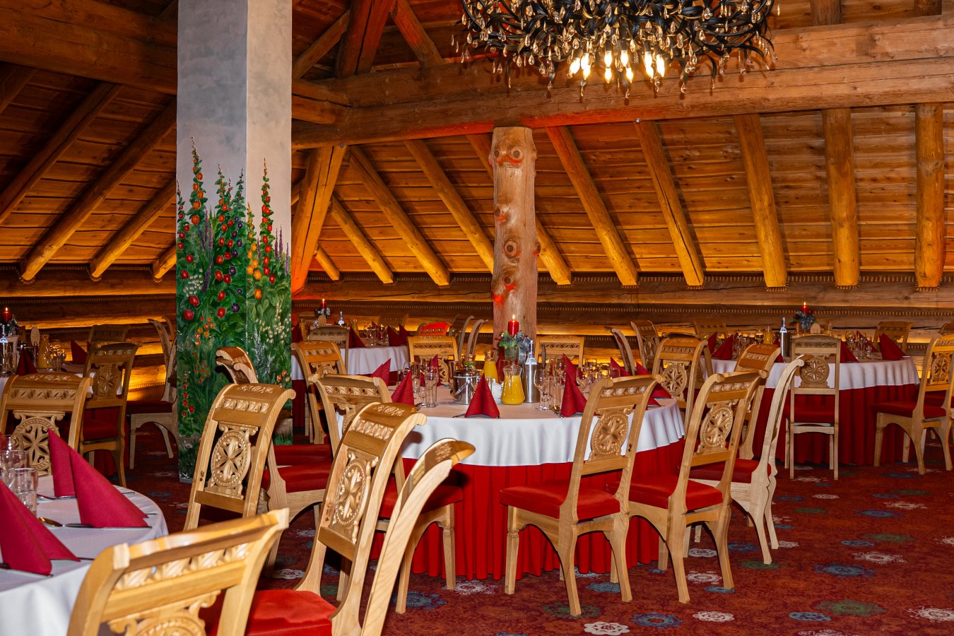 The unique character of the room is determined by the elements of its decor: carved highlander chairs, impressive chandeliers, wooden interior and even hand-painted washbasins. Fixed elements of the decoration, for which we do not charge an additional fee, include: snow-white tablecloths, white or red tablecloths, highlander scarves, elegant banquet napkins, candlesticks and white candles, red carpet (unfolded in front of the entrance to the hall), backlighting the hall with led lights.