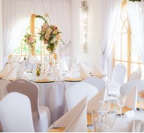 • snow-white covers for chairs and elegant bows in the Crystal Hall